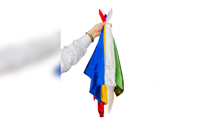 El mago sostiene cuatro pañuelos de seda de diferentes colores, amontonados cerca de una esquina. Extrae uno, lo dobla y lo guarda en el bolsillo. Los pañuelos restantes se arrugan formando una bola. Momentos después, el mago estira los pañuelos, que mágicamente se fusionan formando un gran fular de cuatro colores.